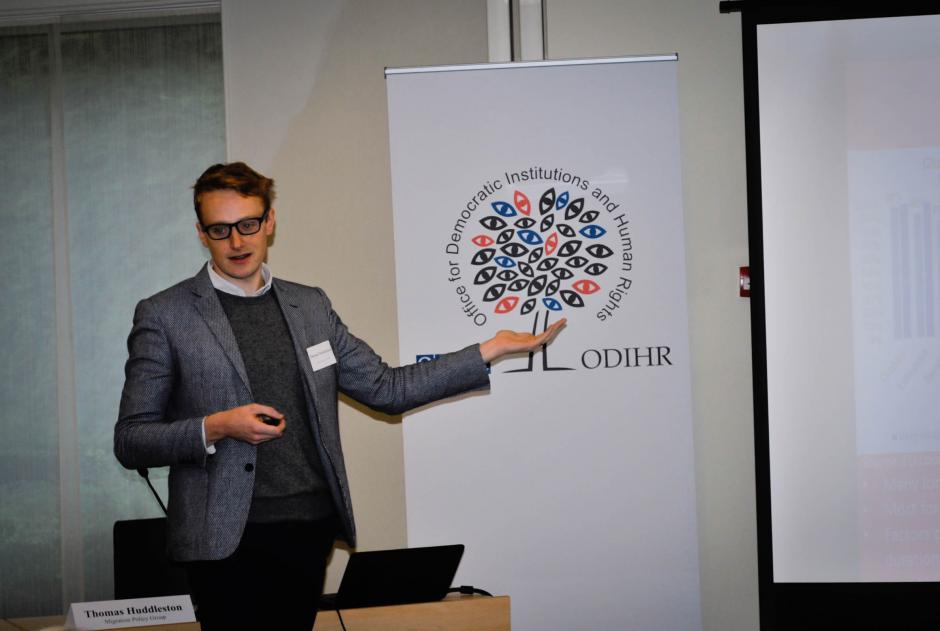 Thomas Huddleston, Programme Director for Migration and Integration at the Migration Policy Group think tank, presenting during an expert roundtable meeting on civic and political participation of migrants organized by the OSCE Office for Democratic Institutions and Human Rights (ODIHR). Brussels, 14 November 2017.