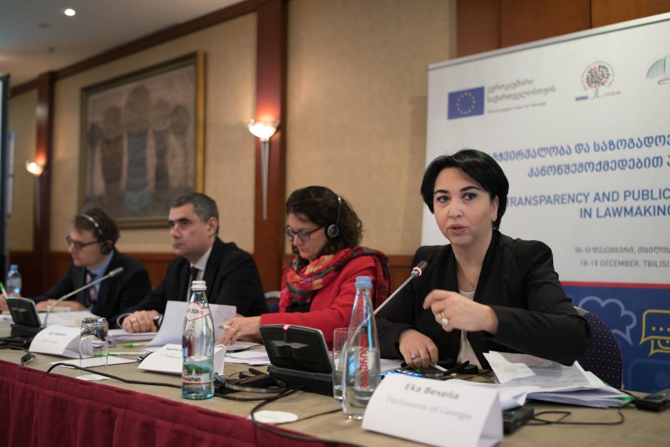 Eka Beselia, Chair of the Legal Issues Committee at the Parliament of Georgia, speaking during a workshop on enhancing transparency and public participation in lawmaking in Georgia, co-organized by the OSCE Office for Democratic Institutions and Human Rights (ODIHR). Tbilisi, 18 December 2017.