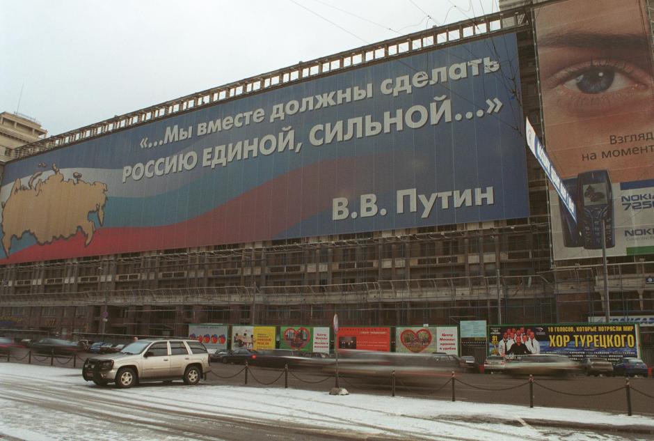 A poster quotes Russian President Vladimir Putin: "Together we must make Russia united and strong..." in downtown Moscow, 6 December 2003, a day before the State Duma elections.