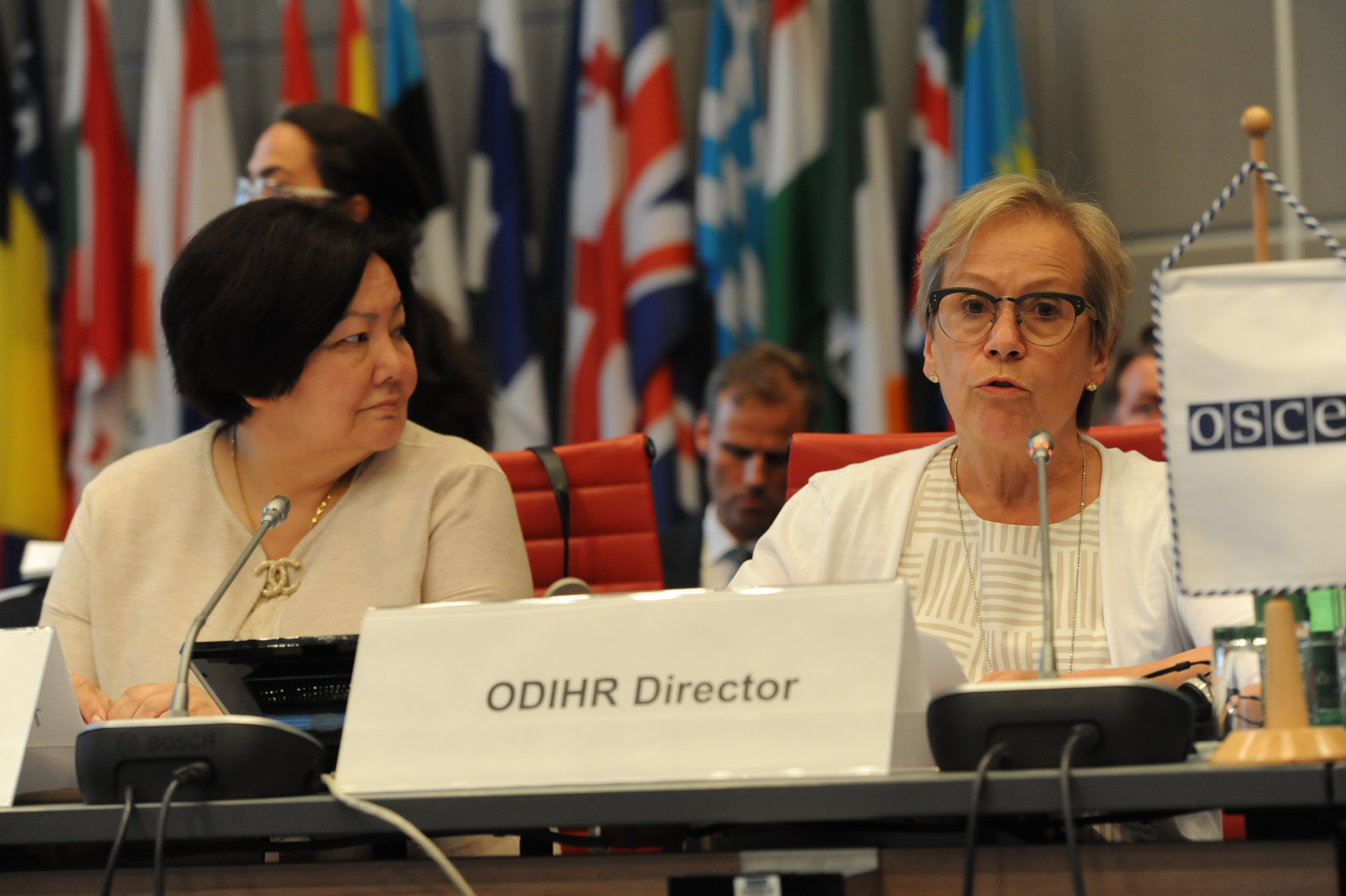 Madina Jarbussynova, OSCE Special Representative and Co-ordinator for Combating Trafficking in Human Beings, listening as ODIHR Director Ingibjörg Sólrún Gísladóttir addresses the Supplementary Human Dimension Meeting on "Child Trafficking - From Prevention to Protection" in Vienna, 28 May 2018 (OSCE/Micky Kroell).