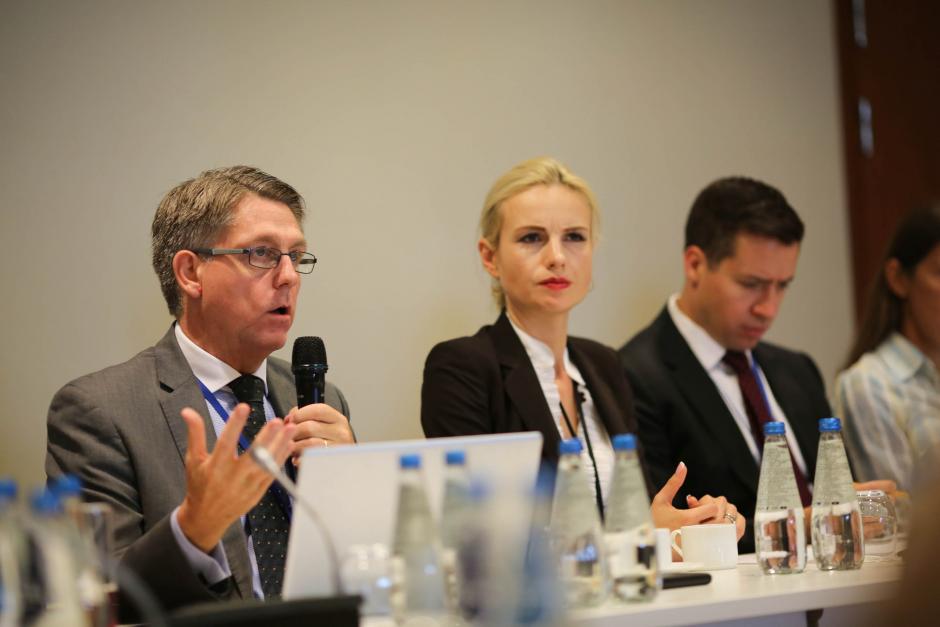 Panelists discuss gender dynamics of human trafficking at an event organized by the OSCE Office for Democratic Institutions and Human Rights (ODIHR) and the OSCE Office of the Special Representative and Co-ordinator for Combating Trafficking in Human Beings during the 2018 OSCE Human Dimension Implementation Meeting: Kevin Hyland, Chief Executive of ChildFund Ireland (l), Tatiana Kotlyarenko, ODIHR Advisor on Anti-Human Trafficking Issues (c), and Valiant Richey, OSCE Acting Co-ordinator for Combating Trafficking in Human Beings (r). Warsaw, 19 September 2018.