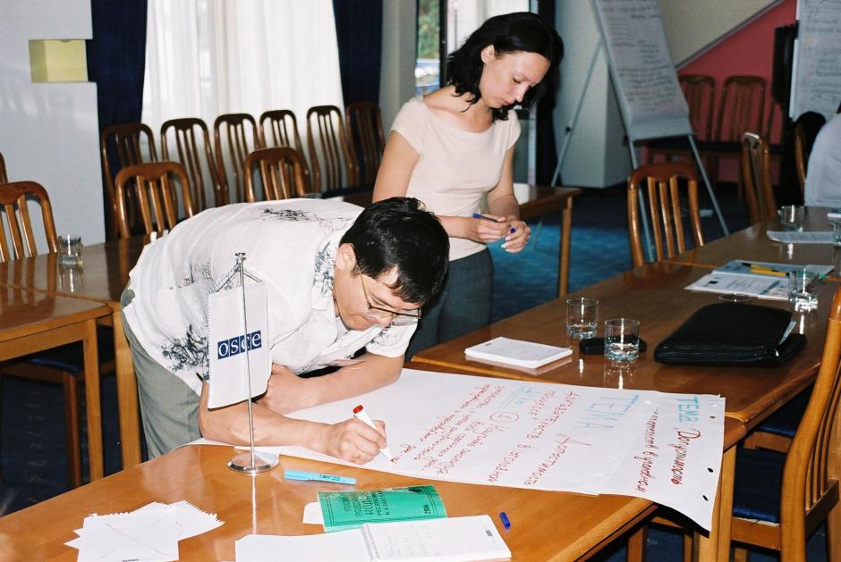 Lawyers prepare materials for developing legal skills at a training-of-trainers workshop in Almaty, June 2004.