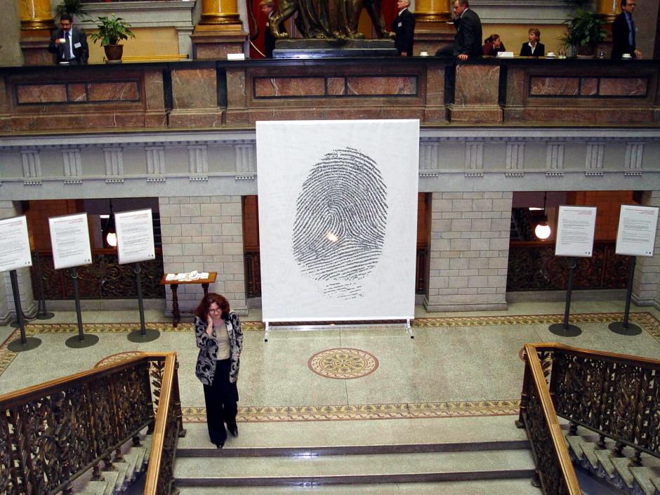 A fingerprint made up of the Universal Declaration of Human Rights was the symbol for an OSCE conference in Helsinki on protecting the rights of trafficking victims, 23-24 September 2004