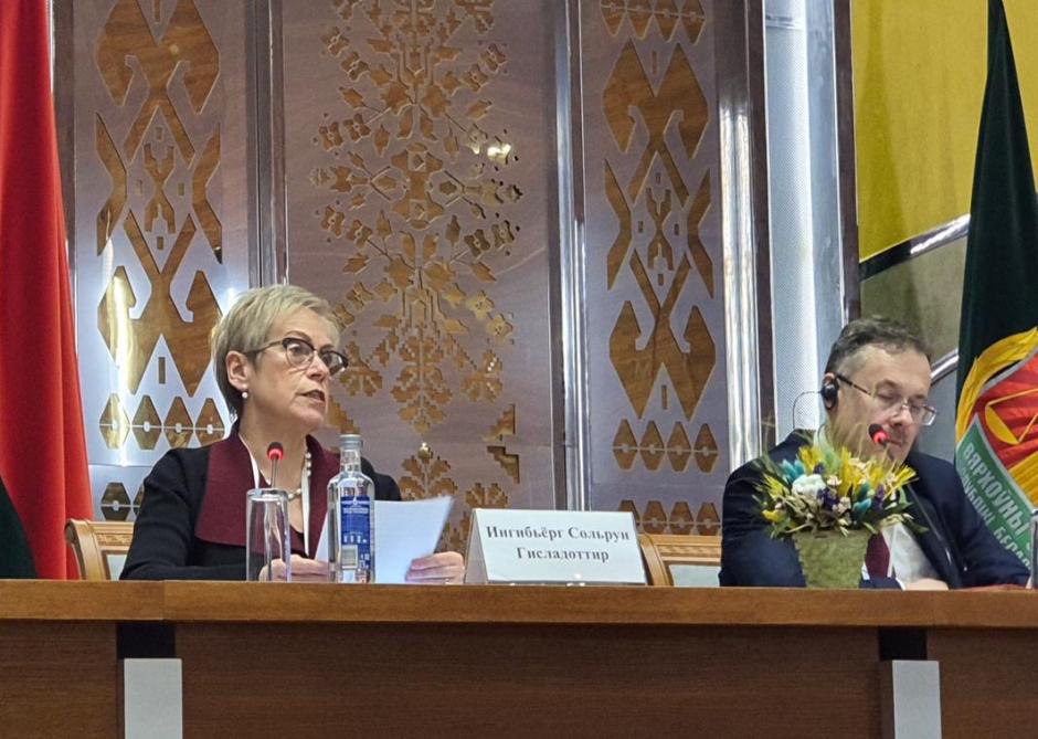 Ingibjörg Sólrún Gísladóttir (l), Director of the OSCE Office for Democratic Institutions and Human Rights (ODIHR), and Valery Kalinkovich (r), First Deputy Chairperson of the Supreme Court of Belarus, during a rule of law conference co-organized by ODIHR, the Supreme Court and the Council of Europe, with the support of the Ministry of Foreign Affairs of the Netherlands, in Minsk on 27 February 2020.