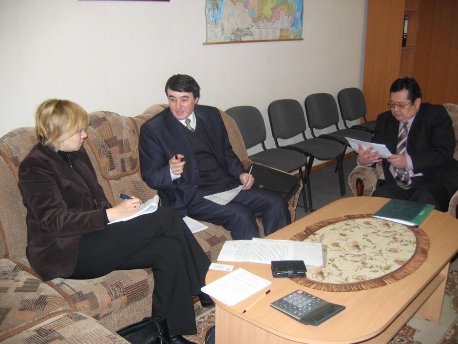 ODIHR Migration Officer Nadzeya Zhukava (left) discusses the situation of migrant workers in Russia with Ibragim Abdulaev of the Tajik Labour Ministry in Yekaterinburg, Russia, December 2004.