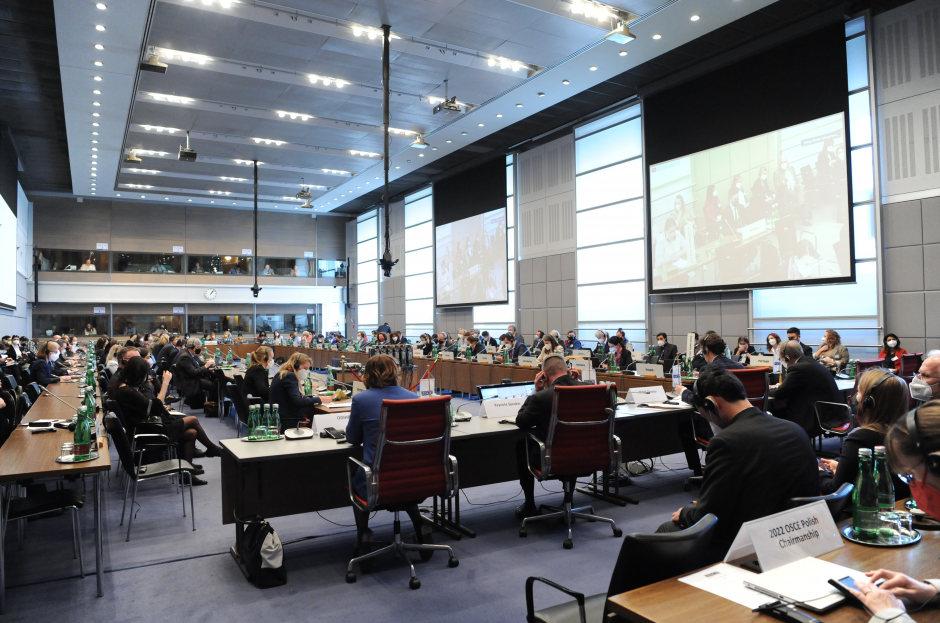 The opening session of the Supplementary Human Dimension Meeting on international co-operation to address violations of international humanitarian law and international human rights law. Vienna, 28 March 2022.