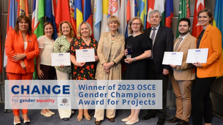 Kateryna Ryabiko (4R), ODIHR's First Deputy Director, with OSCE Secretary General Helga Maria Schmid, OSCE Senior Adviser on Gender Issues Lara Scarpitta and Chairperson of the OSCE Permanent Council Ambassador Djundev and the winners of Gender Champions Award, Vienna, 13 July 2023.