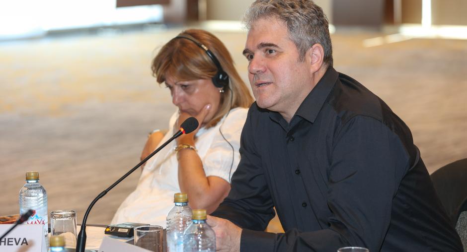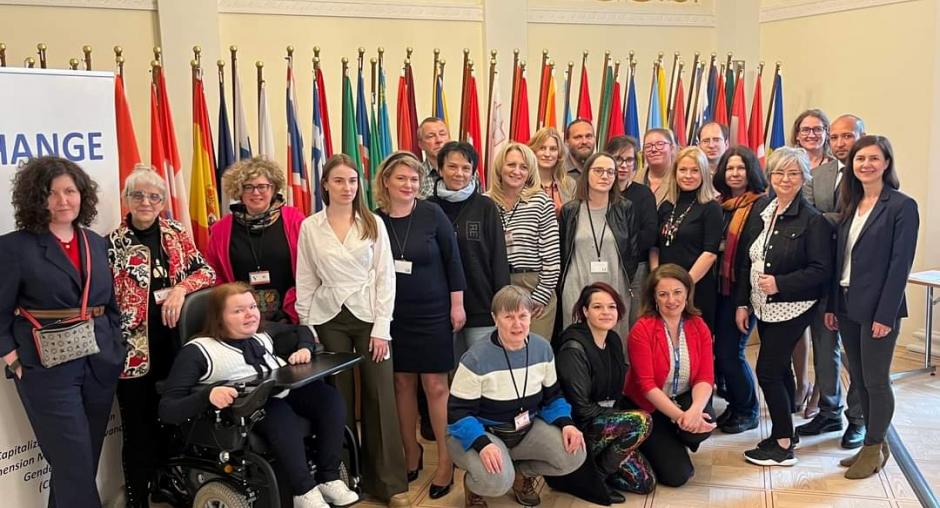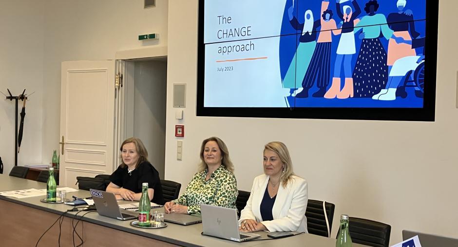Gorica Atanasova-Gjorevska, Minister Plenipotentiary at the Permanent Mission of North Macedonia to the OSCE, Sanja Nikolin, CHANGE Project Officer, presentation before the Gender Champions Award ceremony, Vienna, 13 July 2023. (OSCE/ODIHR)