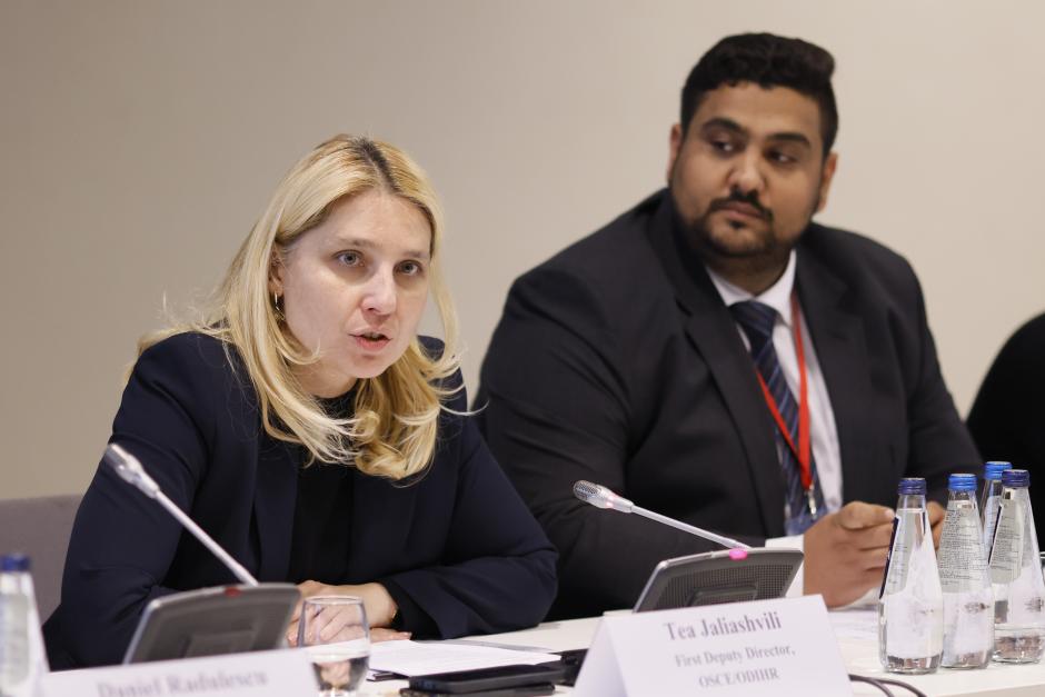 Tea Jaliashvili, First Deputy Director of the OSCE Office for Democratic Institutions and Human Rights (ODIHR), addresses participants in an event on improving access to healthcare and housing for Roma and Sinti communities, organized by ODIHR at the margins of the Warsaw Human Dimension Conference. 11 October 2023.