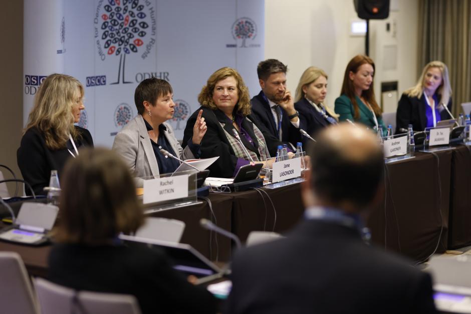Participants at the launch of the OSCE Office for Democratic Institutions and Human Rights (ODIHR) new guidance on establishing National Survivor of Trafficking Advisory Councils (NSTACs) during the 2024 Warsaw Human Dimension Conference.