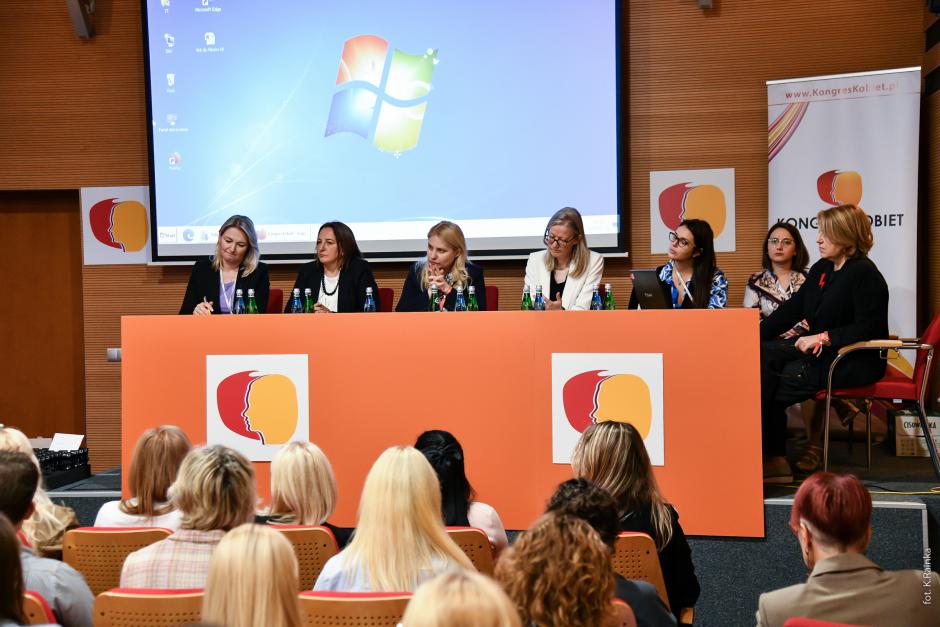 Mariya Ionova, Ukrainian Women Congress; Elene Rusetskaia, Founder and Director, Women’s Information Center, Georgia; Tea Jaliashvili, ODIHR First Deputy Director; Anna Clunes, UK Ambassador to Poland, Ludovica Efrati, EBRD; Rita Behadini, Journalist; Aleksandra Karasińska, host, during the XVI Polish Women Congress, Gdansk, Poland, 28-29 September 2024.