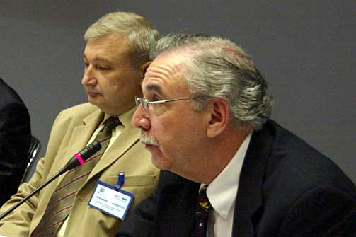 David Goldberger (front) and Alexander Vashkevich, members of the ODIHR Panel of the Freedom of Assembly, at a roundtable on legislation affecting freedom of assembly, Belgrade, 28 June 2006.