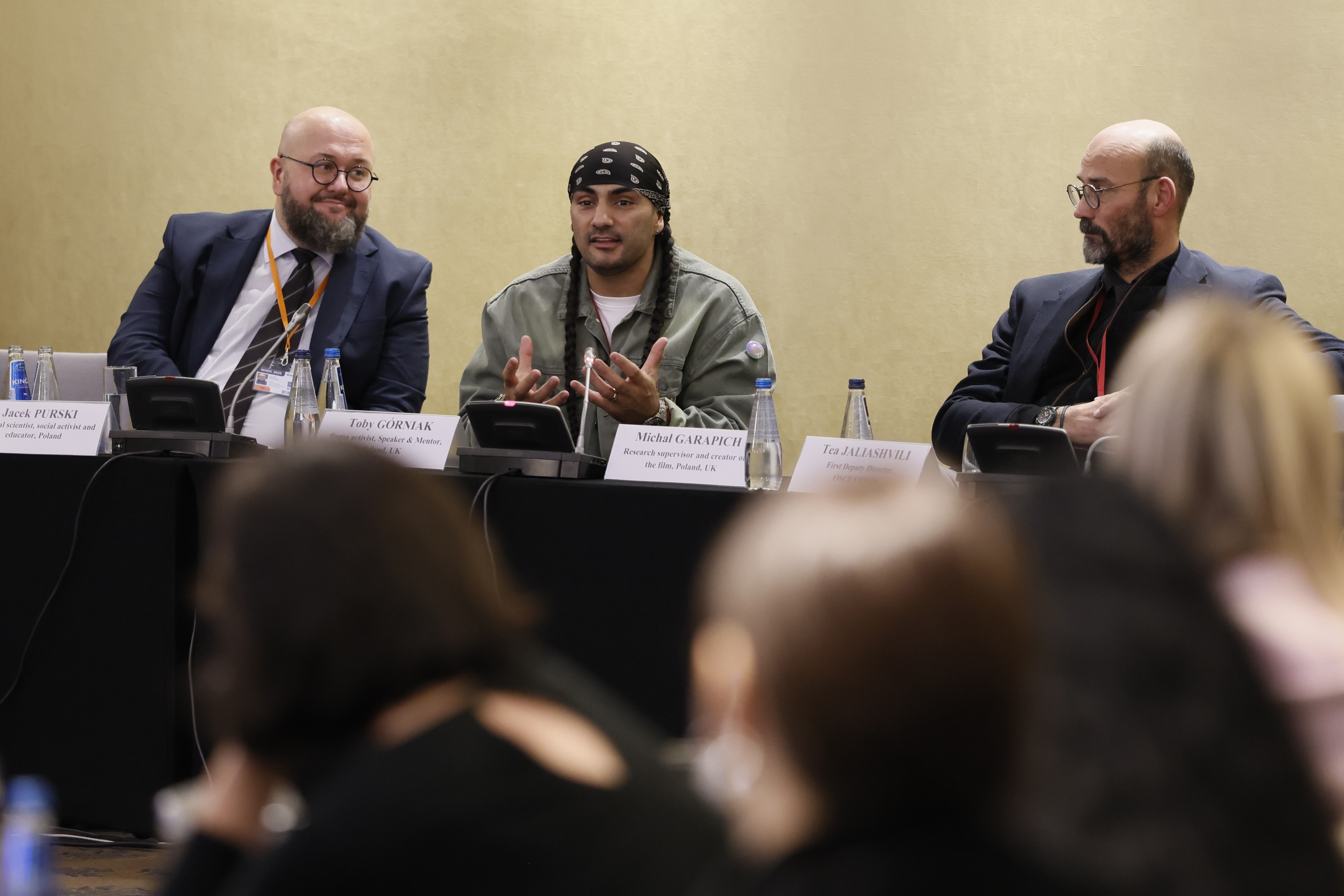 Toby Górniak (centre), Roma rights activist, in discussion after the screening of the film That Boy. Warsaw, 13 October 2025.