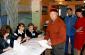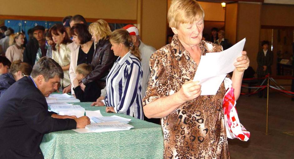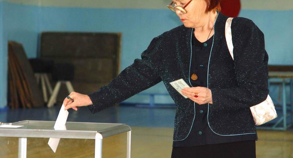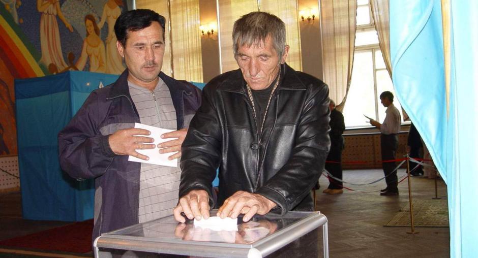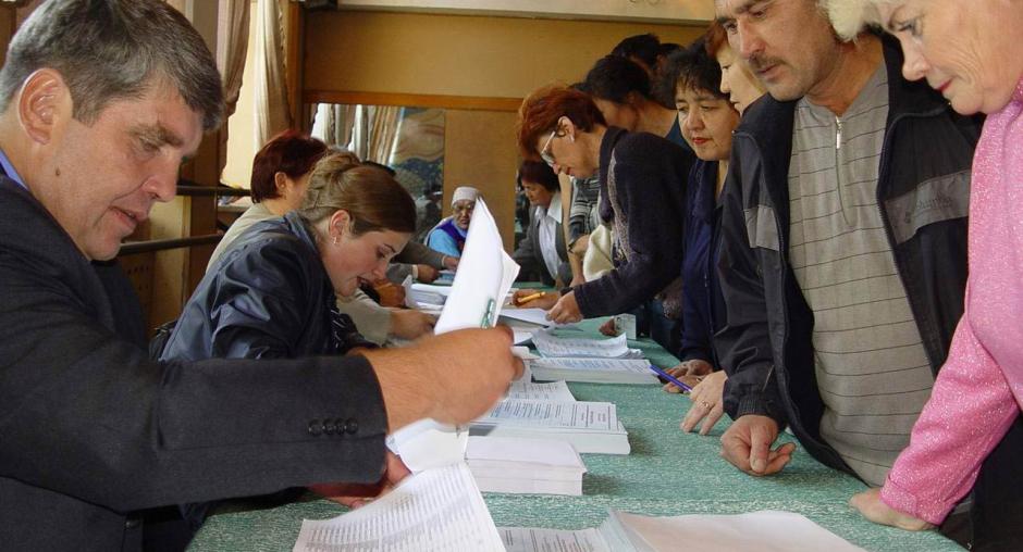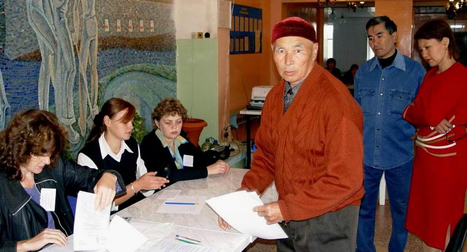 Election officials at a polling station in Malinovka check names in the voter registry before handing out ballots during the parliamentary elections in Kazakhstan, 19 September 2004. (OSCE/Urdur Gunnarsdottir)