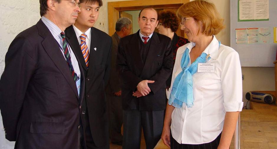 ODIHR Director Amb. Christian Strohal (centre) meets an election official at a polling station in Malinovka during parliamentary elections in Kazakhstan, 19 September 2004. (OSCE/Urdur Gunnarsdottir)