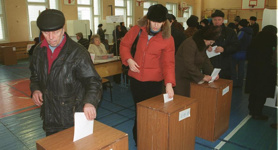 An OSCE observer at a polling station in the town of Balashikha outside Moscow, where Interior Ministry soldiers line up to vote for the Duma elections, 7 December 2003. (OSCE/Mikhail Evstafiev)