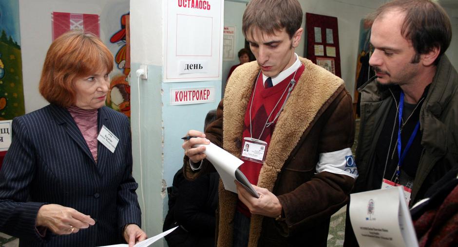 OSCE/ODIHR election observers at a polling station in Kant during the 16 December 2007 parliamentary elections in Kyrgyzstan. (OSCE/Urdur Gunnarsdottir)