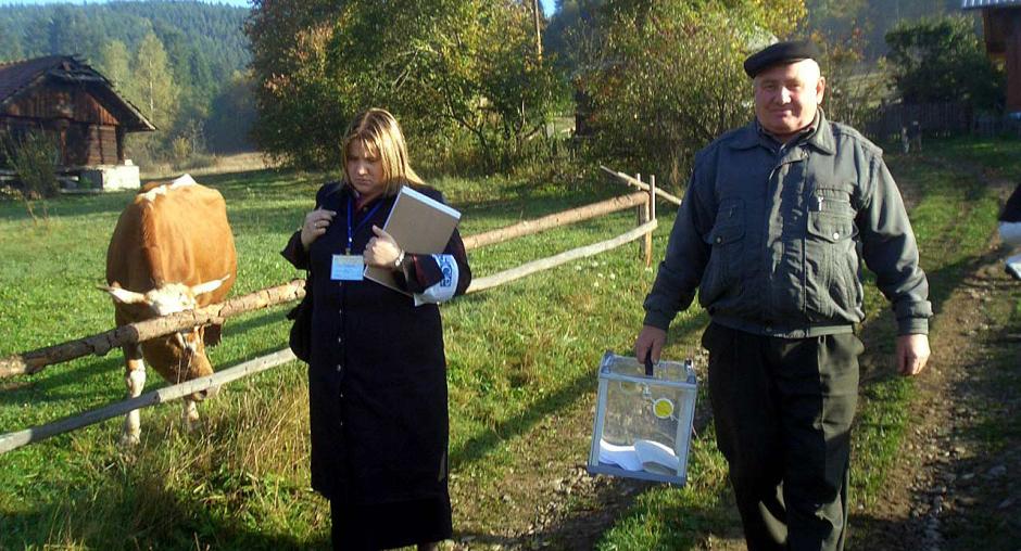 An OSCE election observer (left) accompanies the mobile ballot box in Isaj near the city of Turka during the 30 September 2007 parliamentary elections in Ukraine. (OSCE/Stephan Heidenhain)
