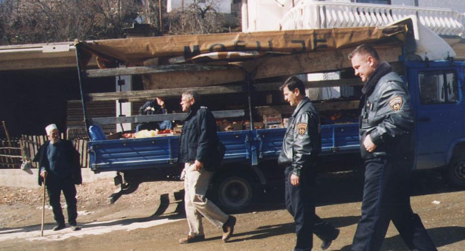 Ethnically mixed police patrols conduct routine checks in the village of Srbinovo, former Yugoslav Republic of Macedonia, February 2002. (Marko Georgiev)