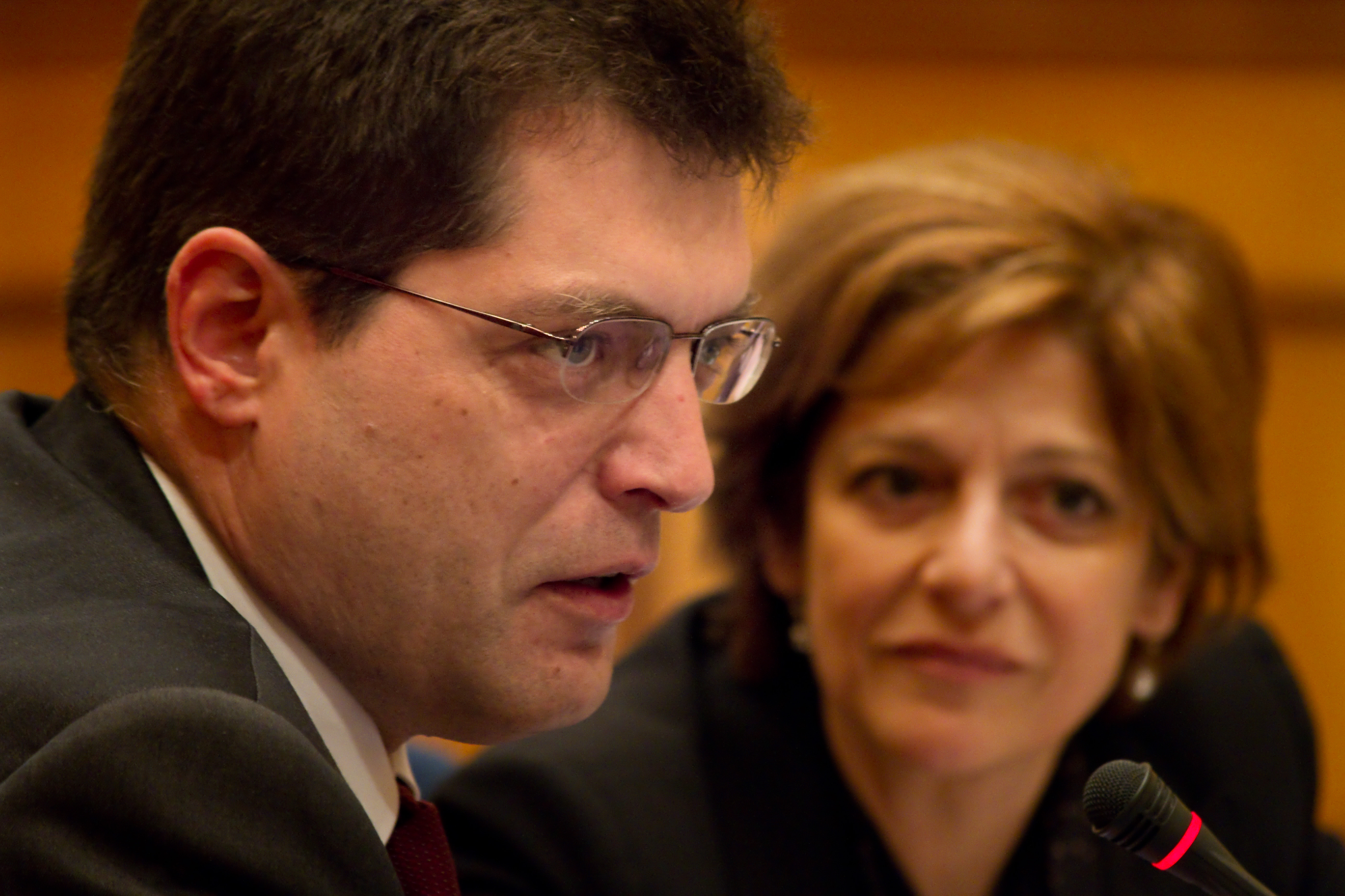 ODIHR Director Ambassador Janez Lenarcic speaks at the opening of a meeting on trafficking issues in Warsaw, on 14 April 2010, as the OSCE's Special Representative on Trafficking in Human Beings, Maria Grazia Giammarinaro, looks on.