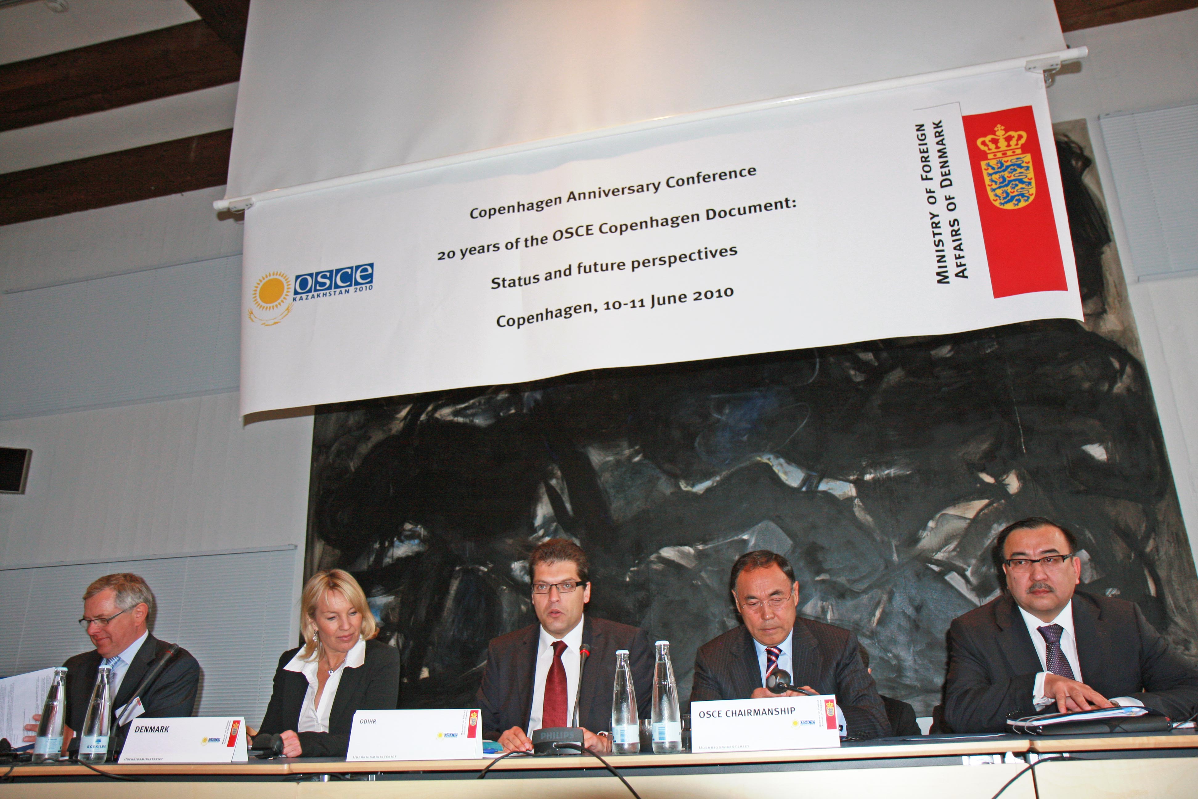 From left: Danish Foreign Minister Lene Espersen; ODIHR Director Janez Lenarcic; and OSCE CiO, Kazakhstan's Secretary of State and Foreign Minister Kanat Saudabayev, at a conference to mark the 20th anniversary of the Copenhagen Document, 10 June 2010.