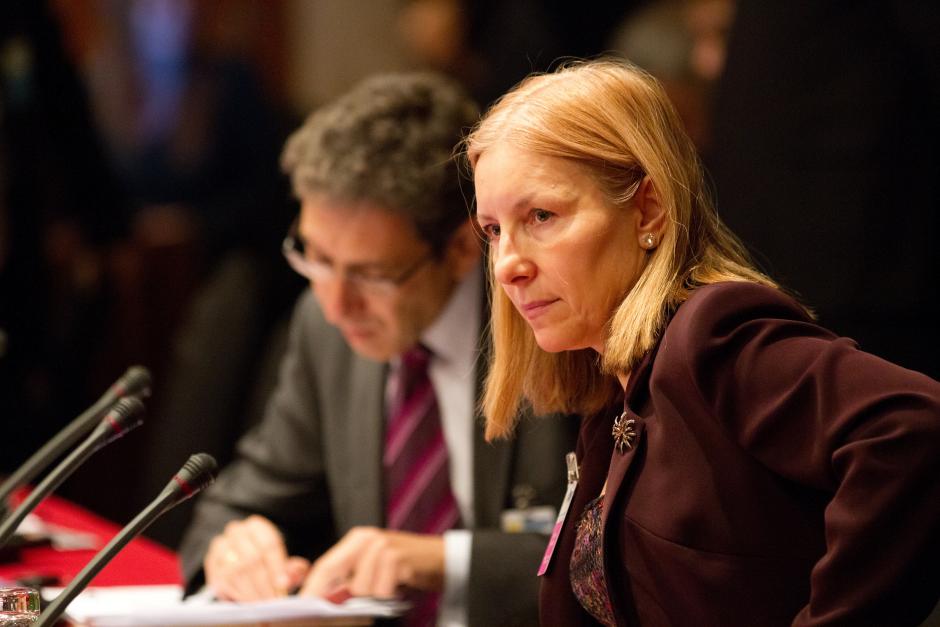 Dimitrina Petrova, Executive Director of the Equal Rights Trust, and Stephanos Stavros, Executive Secretary of the European Commission against Racism and Intolerance, prepare for a session at the OSCE's Review Conference in Warsaw, Poland, 8 October 2010.