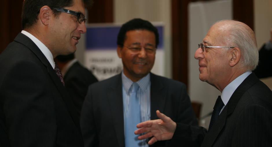 Ambassador Janez Lenarčič, the Director of the OSCE Office for Democratic Institutions and Human Rights (l) speaking to Judge Fausto Pocar (r) of the International Criminal Tribunal for the former Yugoslavia (ICTY) as Jonathan Lucas (c), the Director of the UN Interregional Crime and Justice Research Institute (UNICRI) looks on, at an event marking the end of the 18-month War Crimes Justice Project, 26 October 2011. (OSCE)