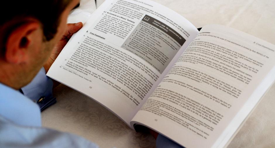A participant at an advocacy-skills training for defence lawyers appearing in war crimes cases leafs through the Manual on International Criminal Defence in a session organized as part of the War Crimes Justice Project, Prishtinë/Priština, 19 October 2011. (OSCE/Driton Paqarada)