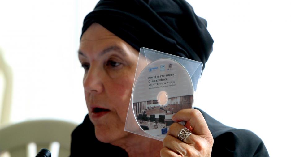 Colleen Rohan, Defence Counsel at the International Criminal Tribunal for the former Yugoslavia, holds up a CD-ROM version of the Manual on International Criminal Defence at an advocacy-skills training for defence lawyers appearing in war crimes cases as part of the War Crimes Justice Project, Prishtinë/Priština, 19 October 2011. (OSCE/Driton Paqarada)