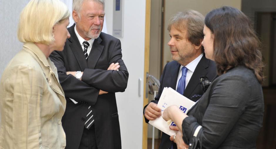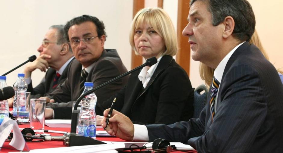 (L-r) Ambassador Leopold Maurer, the Head of the European Union Delegation to Montenegro; Judge Fausto Pocar from the International Criminal Tribunal for the former Yugoslavia (ICTY); Judge Vesna Medenica, the President of the Supreme Court of Montenegro and Ambassador Šarunas Adomavičius, the Head of the OSCE Mission to Montenegro addressed participants at a peer-to-peer meeting of ICTY Judges and their counterparts from the region, organized as part of the War Crimes Justice Project, in Bečići, Montenegro, 27 June 2011. (OSCE/Dejan Kalezić)