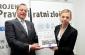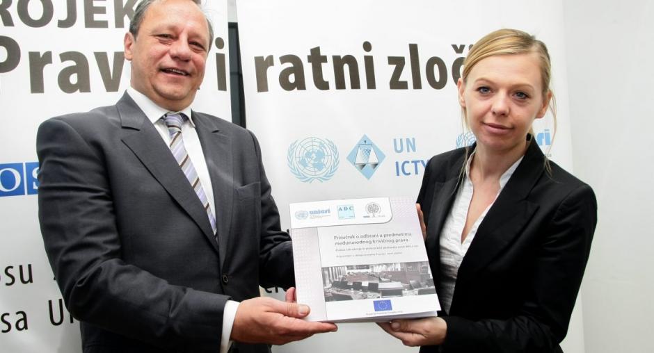 Slobodan Zečević, Defence Counsel and President of ADC (left) and Alma Pintol of the UN Interregional Crime and Justice Research Institute (UNICRI) hold up a copy of the Serbian version of the Manual on International Criminal Defence, developed as part of the War Crimes Justice Project. 25 October 2011. (OSCE)