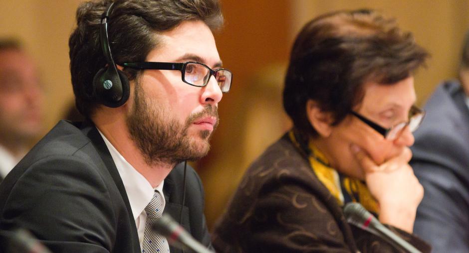 ODIHR Human Rights Adviser Benjamin Moreau (l) listens to a statement being made during the session on freedom of peaceful assembly at the OSCE's Review Conference in Warsaw, Poland, 4 October 2010. (OSCE/Curtis Budden)