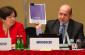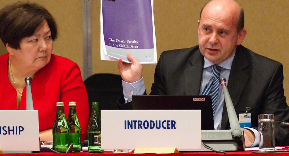 Eric Svanidze, a consultant to the Council of Europe on ill-treatment and torture, holds up a printout of ODIHR's most recent background paper on the death penalty during a session on rule of law at the OSCE's Review Conference in Warsaw, 5 October 2010. (OSCE/Curtis Budden)