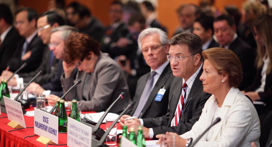 The President of the OSCE Parliamentary Assembly, Petros Efthymiou (second from right), addresses the opening plenary session of the Organization's Review Conference in Warsaw, 30 September 2010. (Piotr Markowski)