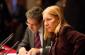 Dimitrina Petrova, Executive Director of the Equal Rights Trust, and Stephanos Stavros, Executive Secretary of the European Commission against Racism and Intolerance, prepare for a session at the OSCE's Review Conference in Warsaw, Poland, 8 October 2010. (OSCE/Curtis Budden)