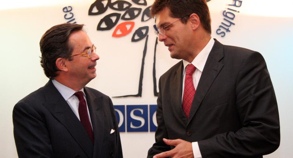 Outgoing ODIHR Director Ambassador Christian Strohal (left) with his successor, Ambassador Janez Lenarcic (right), 9 June 2008. Lenarcic took over the job on 1 July. (OSCE/Jens Eschenbaecher)