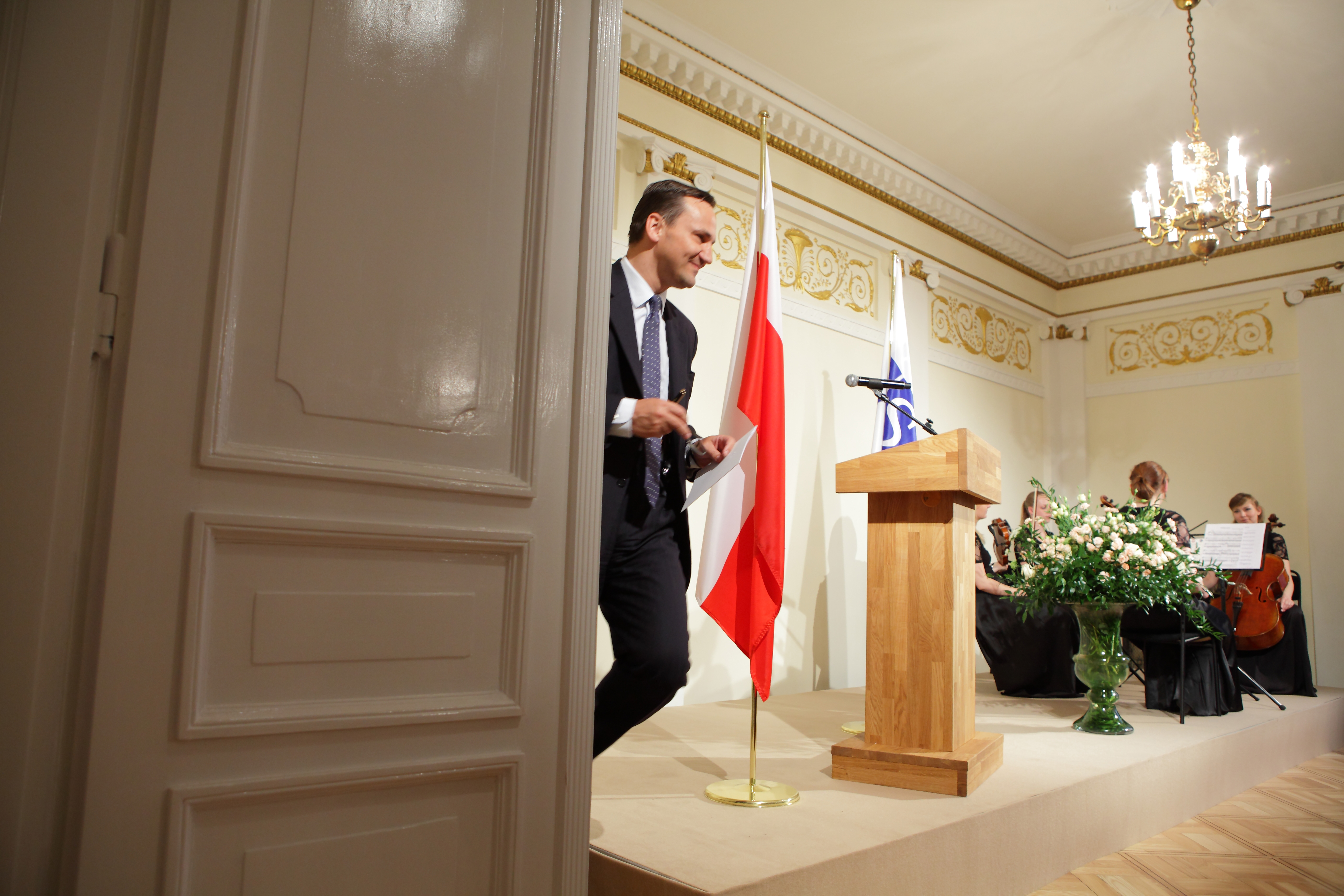 Polish Foreign Minister Radek Sikorski leaves the podium after speaking at a ceremony in Warsaw on 17 May to mark the 20th anniversary of the opening of the OSCE's Office for Democratic Institutions and Human Rights.