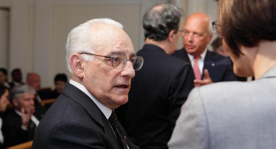 OSCE Secretary General Marc Perrin de Brichambaut (l) speaks with former ODIHR Director Ambassador Gérard Stoudmann at a ceremony to celebrate ODIHR's 20th anniversary in Warsaw on 17 May. (OSCE/Piotr Markowski)