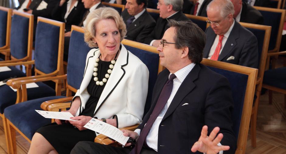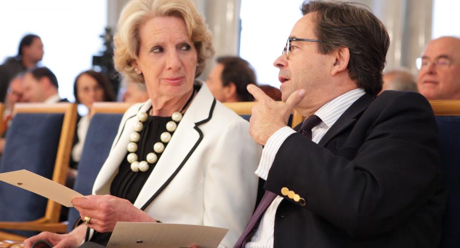 Former ODIHR Directors Audrey Glover (l) and Christian Strohal catch up at a ceremony to mark ODIHR's 20th anniversary in Warsaw on 17 May. (OSCE/Piotr Markowski)