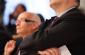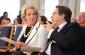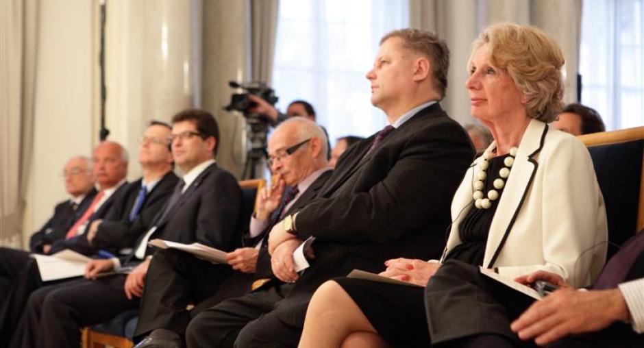 Former ODIHR Director Audrey Glover (r) listens during a speech by Polish Foreign Minister Radek Sikorski at a ceremony in Warsaw on 17 May to mark ODIHR's 20th anniversary. (OSCE/Piotr Markowski)