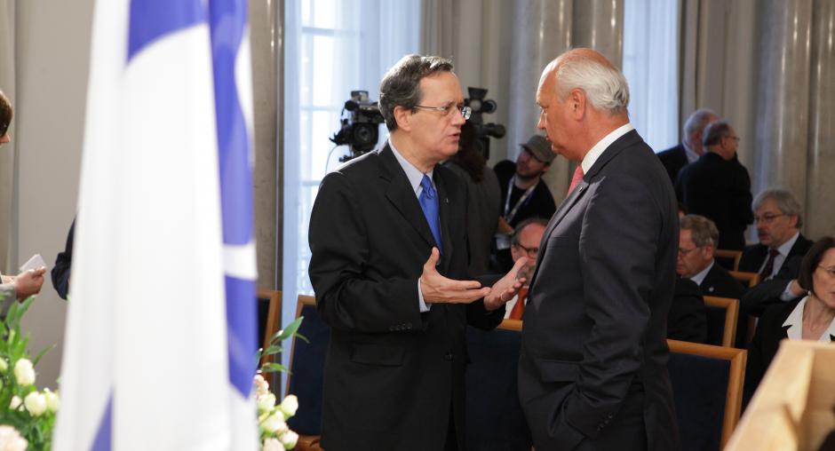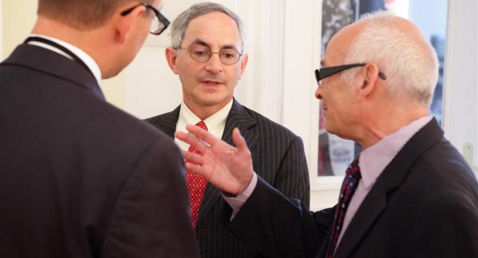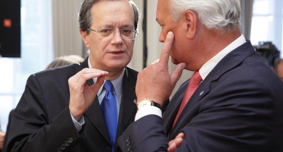 Jan Lityński (r), an adviser to Polish President Bronisław Komorowski, speaks with ODIHR's First Deputy Director Douglas Wake (c) at an event in Warsaw on 17 May to mark ODIHR's 20th anniversary. (OSCE/Piotr Markowski)