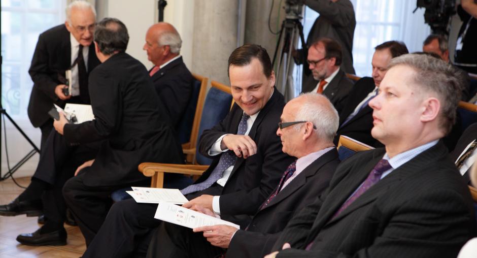 Polish Foreign Minister Radek Sikorski (c) speaks with Polish democracy activist and presidential adviser Jan Lityński at a ceremony marking ODIHR's 20 anniversary in Warsaw on 17 May. (OSCE/Piotr Markowski)