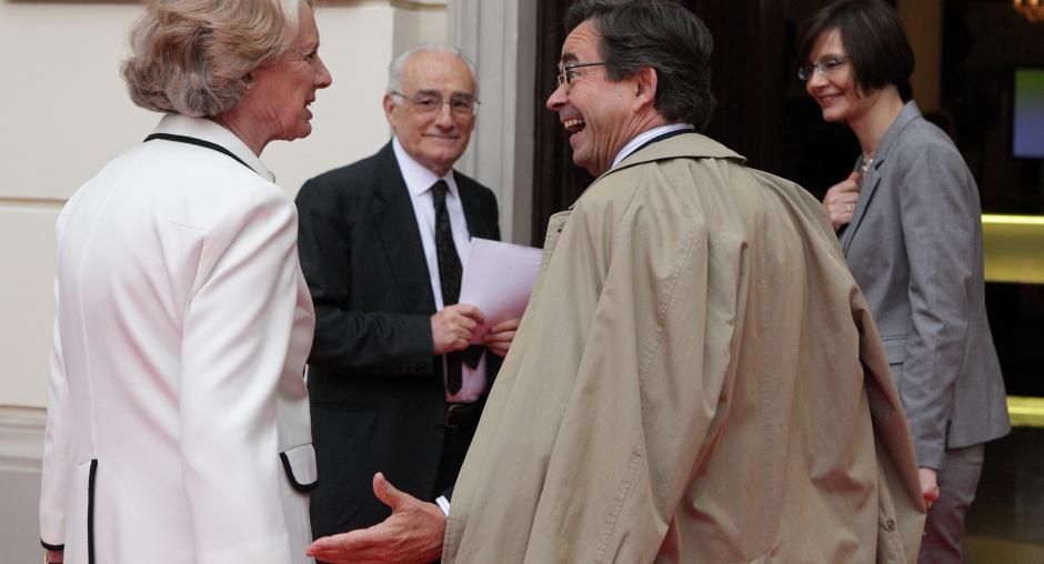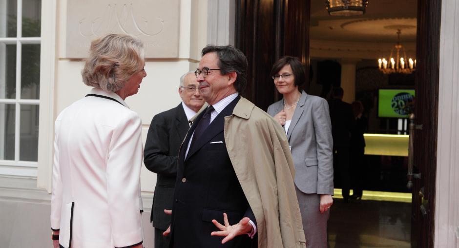 Former ODIHR Directors Audrey Glover (l) and Christian Strohal catch up prior to a ceremony to mark ODIHR's 20th anniversary in Warsaw on 17 May. (OSCE/Piotr Markowski)
