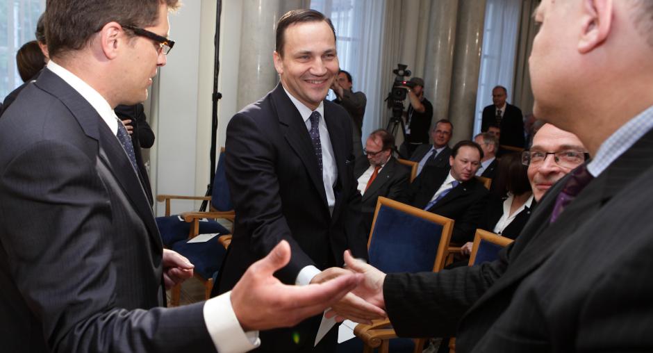 Polish Foreign Minister Radek Sikorski (c) shakes hands with Evaldas Ignatavicius, Deputy Foreign Minister of Lithuania and representative of the OSCE Chairperson-in-Office, as ODIHR Director Ambassador Janez Lenarčič looks on at a ceremony in Warsaw on 17 May to mark ODIHR's 20th anniversary. (OSCE/Piotr Markowski)