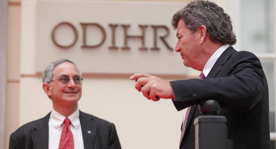 ODIHR First Deputy Director Douglas Wake (l) and Second Deputy Director Anthony Finnerty chatting prior to a ceremony to mark ODIHR's 20th anniversary in Warsaw on 17 May. (OSCE/Piotr Markowski)