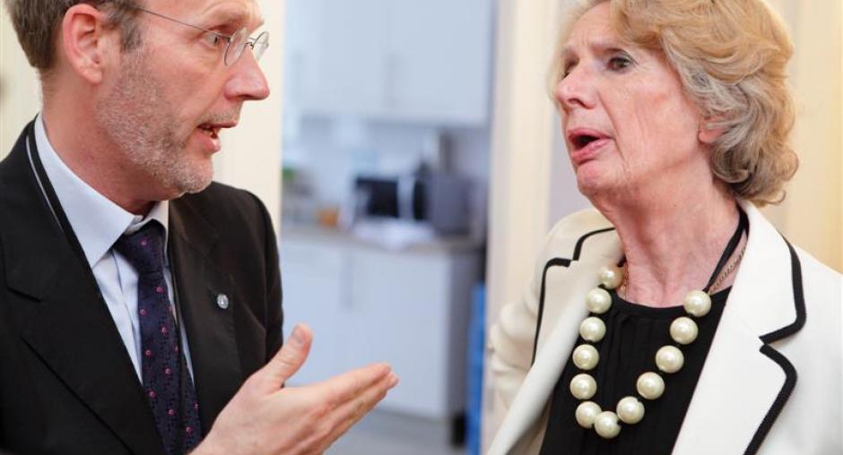 The Head of ODIHR's Democratization Department, Thomas Vennen, speaking with former ODIHR Director Audrey Glover at a ceremony marking ODIHR's 20th anniversary, held in Warsaw on 17 May. (OSCE/Piotr Markowski)