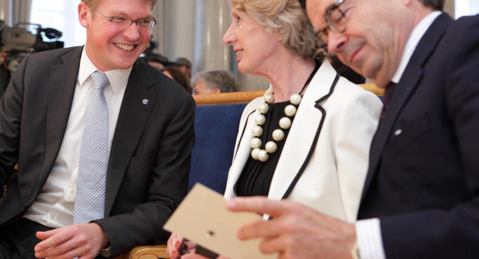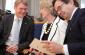 ODIHR Spokesperson Jens Eschenbaecher (l) speaks with former ODIHR Directors Audrey Glover and Christian Strohal at a ceremony celebrating ODIHR's 20th anniversary in Warsaw on 17 May. (OSCE/Piotr Markowski)