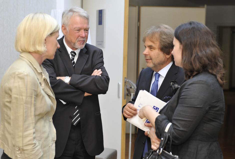 (L-r) Romana Schweiger, the War Crimes Justice Project Regional Co-ordinator; Ambassador Leopold Maurer, the Head of the European Union Delegation to Montenegro and Ambassador Šarunas Adomavičius, the Head of the OSCE Mission to Montenegro at a peer-to-peer meeting of ICTY Judges and their counterparts from the region, organized as part of the War Crimes Justice Project, in Bečići, Montenegro, 27 June 2011. During the meeting Maurer said that bringing war crimes trials to completion is an important part of transitional justice, building democracy and establishing lasting reconciliation.