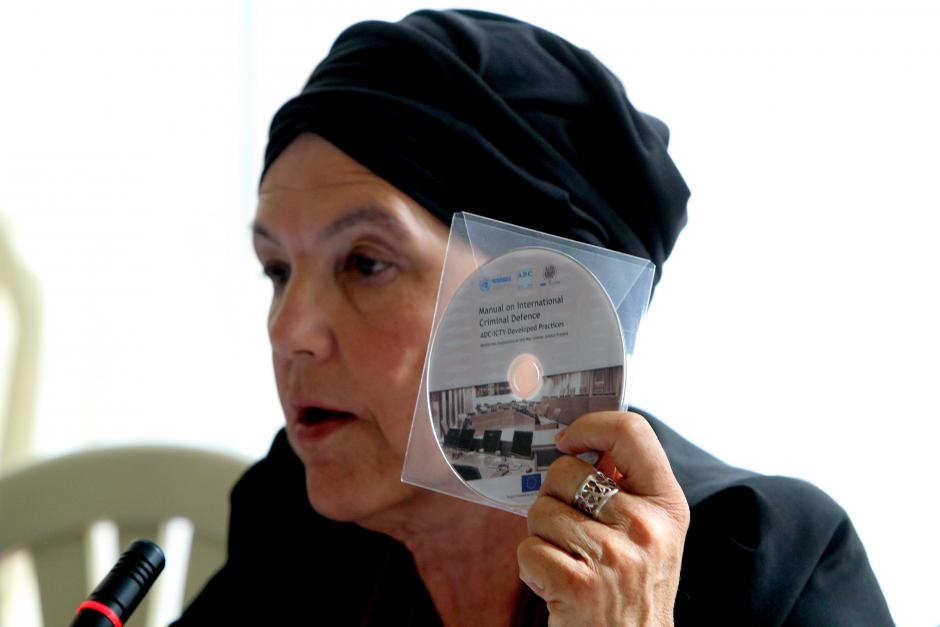 Colleen Rohan, Defence Counsel at the International Criminal Tribunal for the former Yugoslavia, holds up a CD-ROM version of the Manual on International Criminal Defence at an advocacy-skills training for defence lawyers appearing in war crimes cases as part of the War Crimes Justice Project, Prishtinë/Priština, 19 October 2011.