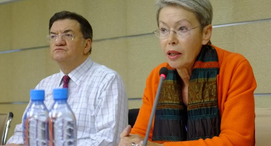 Ambassador Heidi Tagliavini, the head of the OSCE/ODIHR Election Observation Mission in the Russian Federation, and Petros Efthymiou, the Special Co-ordinator to lead the short-term OSCE observer mission and Head of the OSCE Parliamentary Assembly delegation brief short-term observers ahead of election day, Moscow, 1 December 2011.
